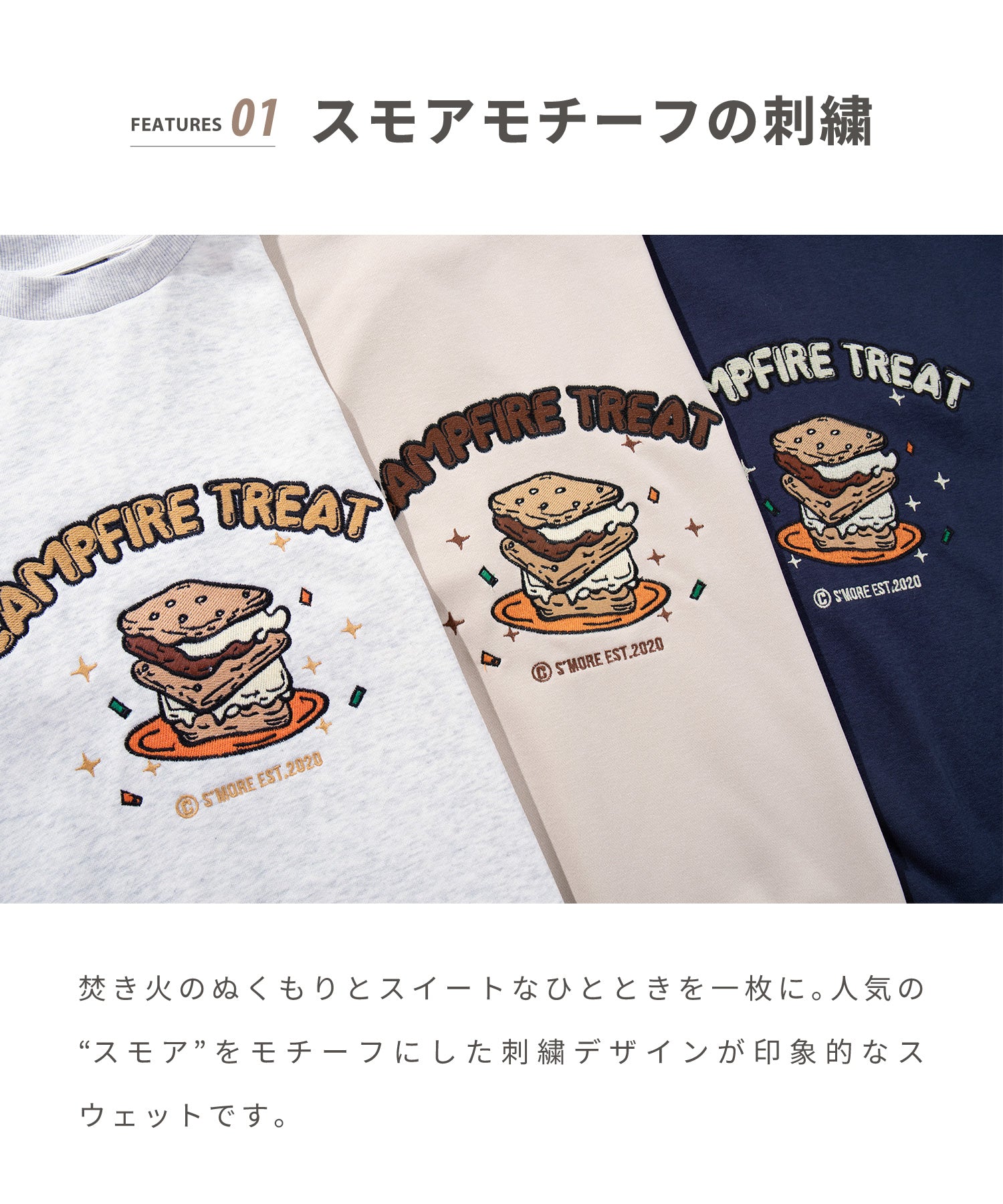 ●焚き火とスイーツ“スモア”をモチーフにした刺繍スウェット